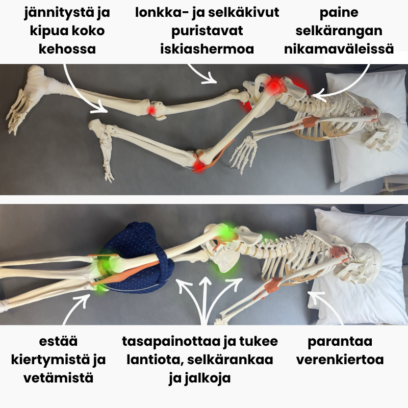 Kyljellään nukkuessa lantio kiertyy, polvet painuvat yhteen ja alaselkään kohdistuu painetta – tämä aiheuttaa jännitystä, joka jatkuu läpi päivän.