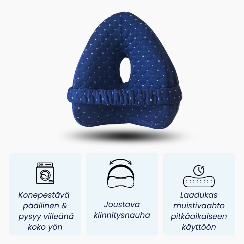 Unohda kömpelöt ja epäergonomiset ratkaisut – tämä tyyny sijoittuu mukavasti reisien väliin ja auttaa sinua löytämään optimaalisen nukkumisasennon heti.